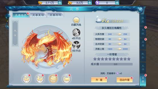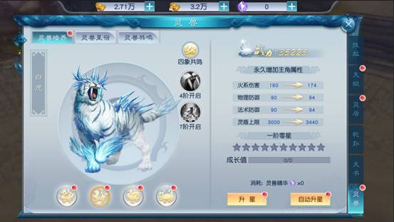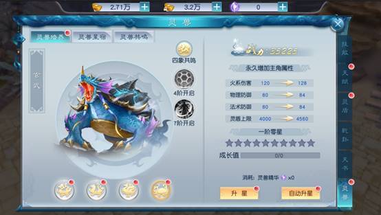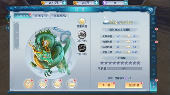 5、激活后,消耗神兽精华对神兽进行升阶,提升属性,更可获得四象共鸣技能;四大灵兽升级到4阶、7阶可获得灵兽专属技能。