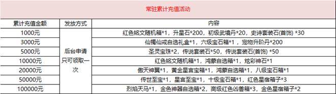 一、常驻累充(活动开启时间后开始累计,累计达到对应档位即可领取一次,每个玩家每个档位只能获取一次,长期有效)